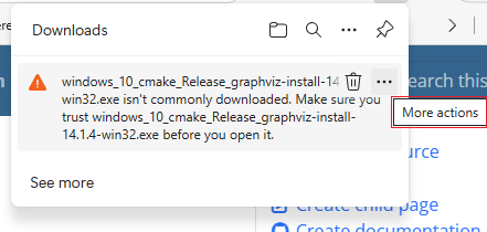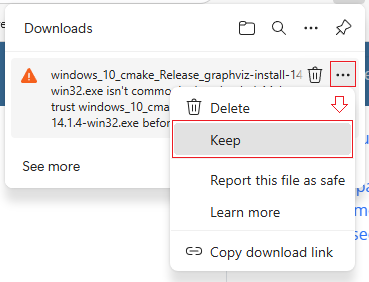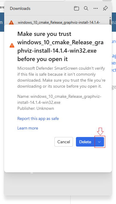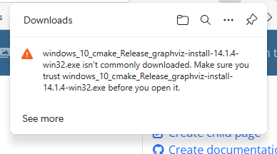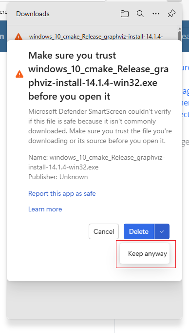 Microsoft Edge will again try to dissuade you from downloading the file with a warning such as “Make sure you trust windows_10_cmake_Release_graphviz-install-14.1.4-win32.exe before you open it”.