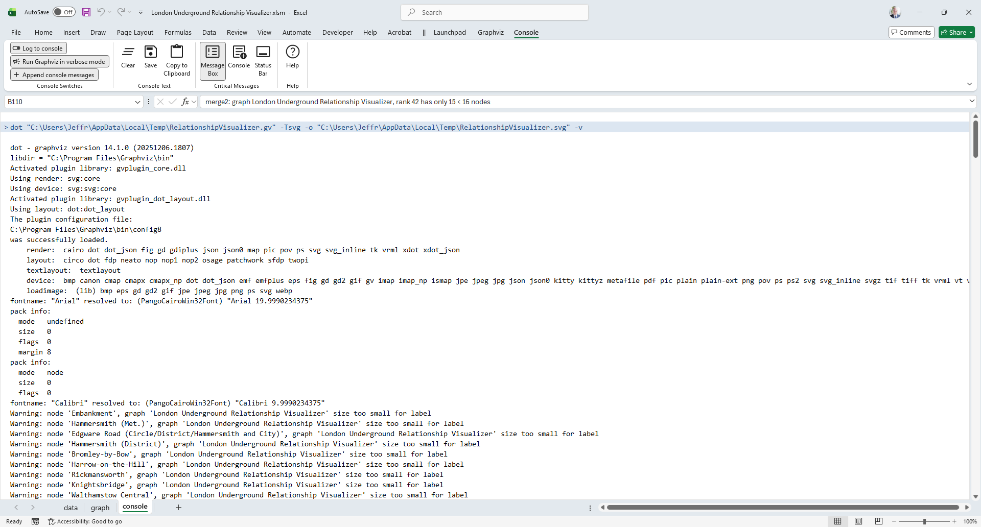 The console worksheet shows the messages emitted by the dot command when Graphviz runs.