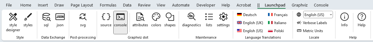 The console worksheet is reached from the Graphviz dot section of the Launchpad ribbon tab.