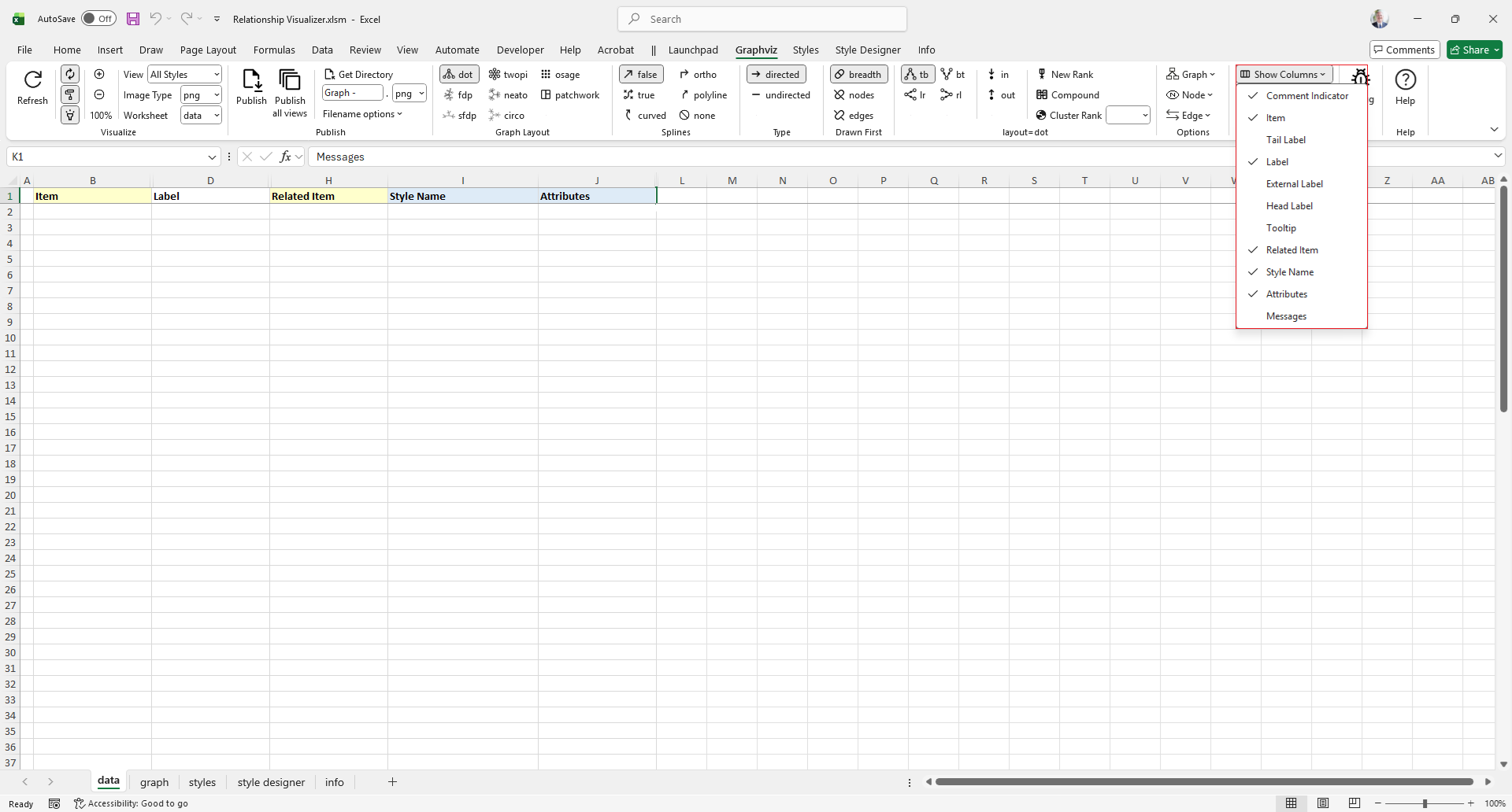 When you reopen the workbook the message stating that macros have been blocked will be gone. The spreadheet will appear as follows, displaying a data worksheet and a custom ribbon tab named Graphviz.