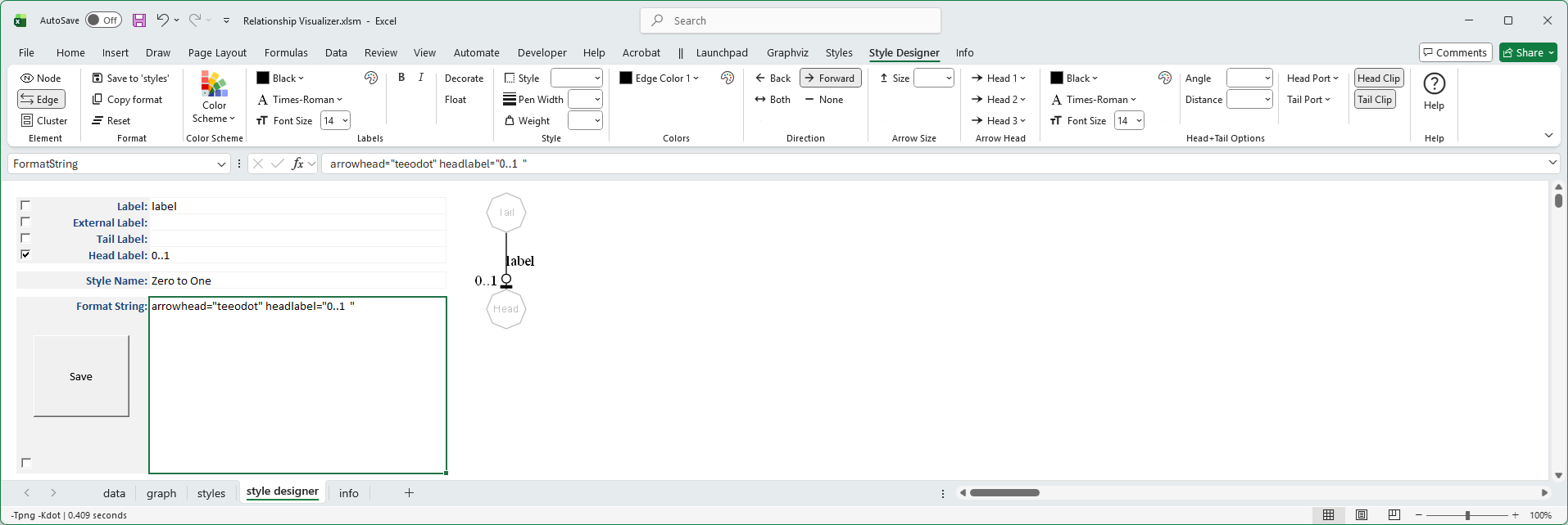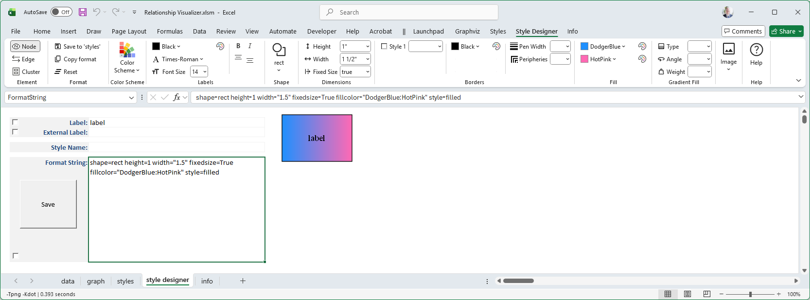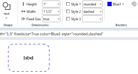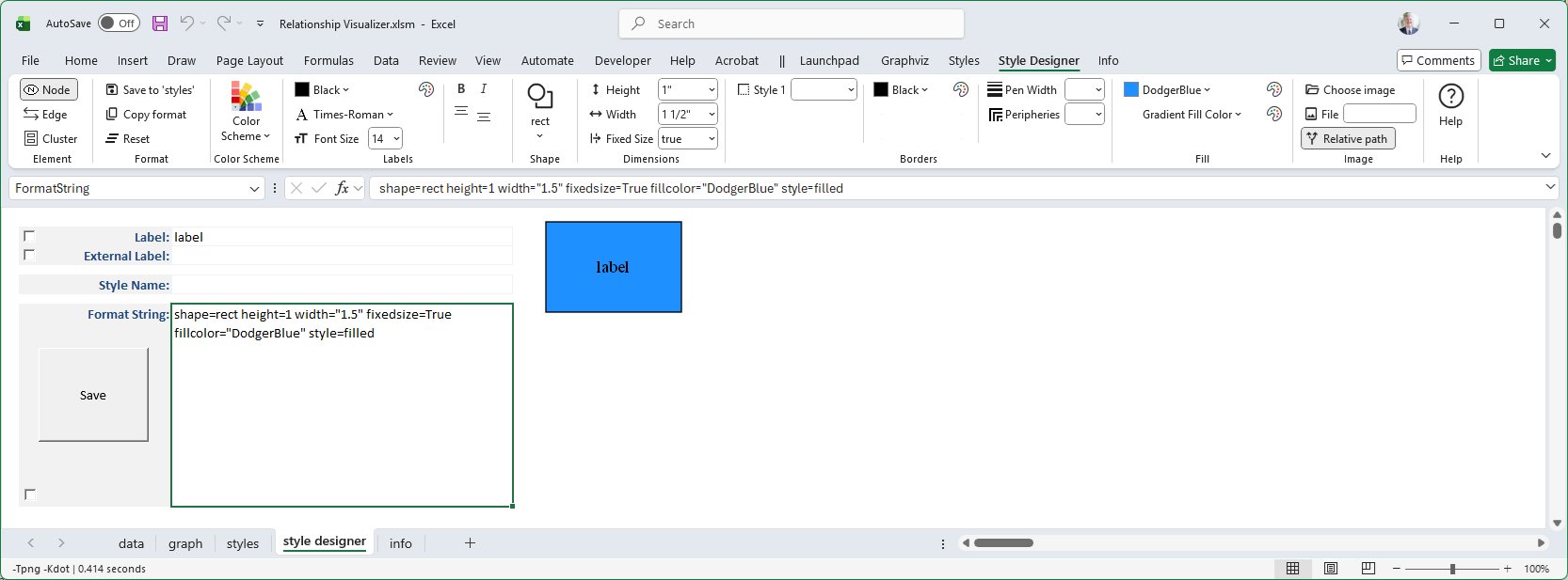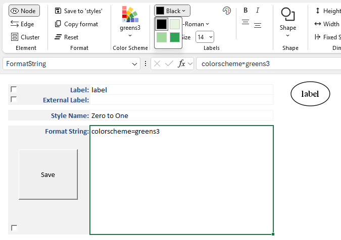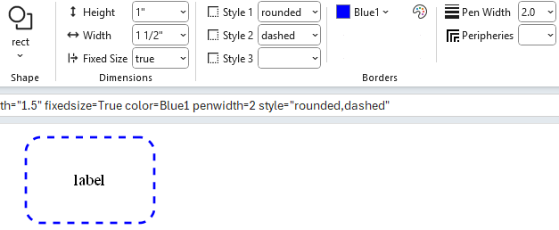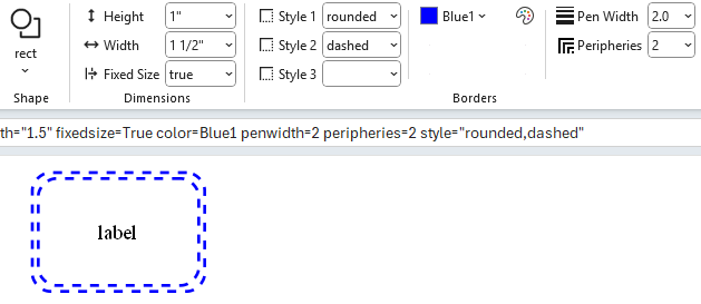You define styles by making selections on the Style Designer ribbon tab. As you choose options, a format string is generated, and a sample rendering of the node, edge, or cluster is produced using the graphing engine and spline values from the Graphviz ribbon tab (explained later).