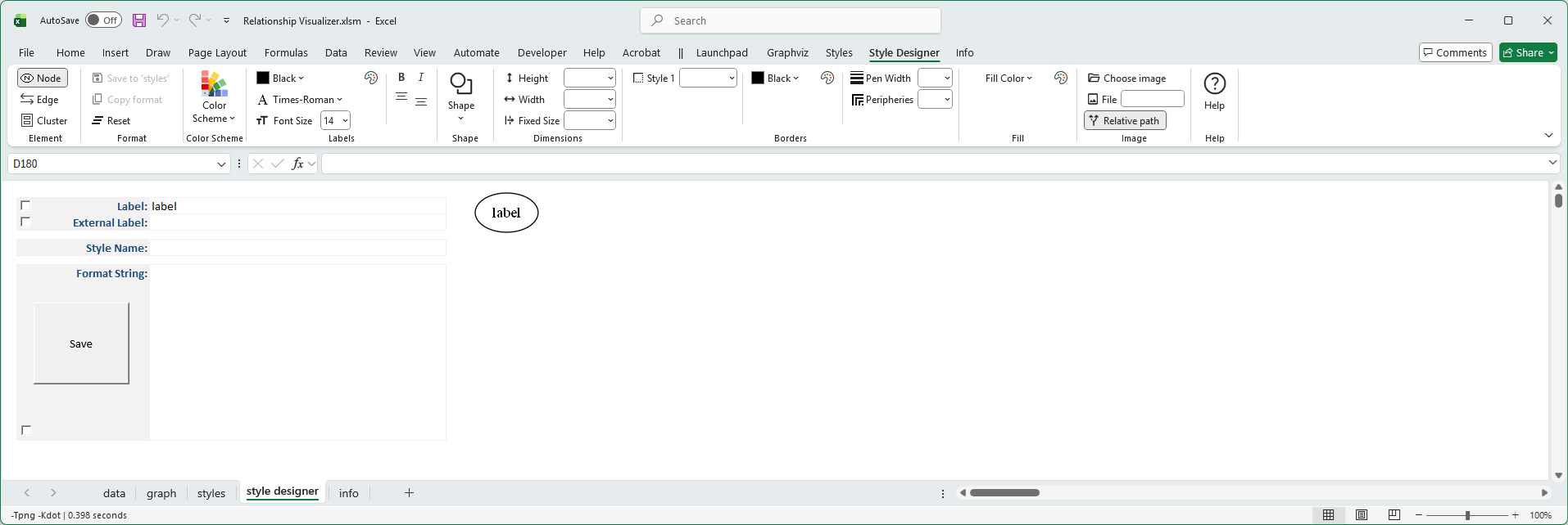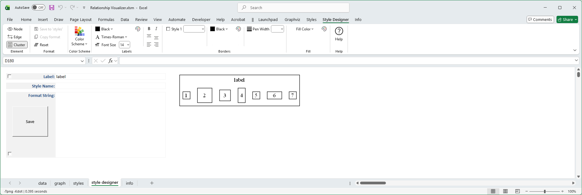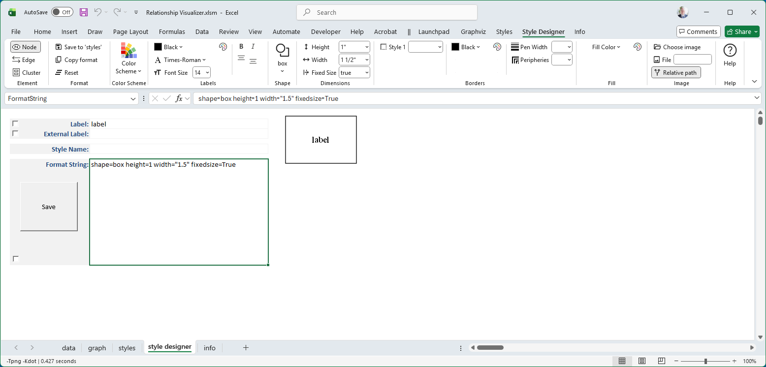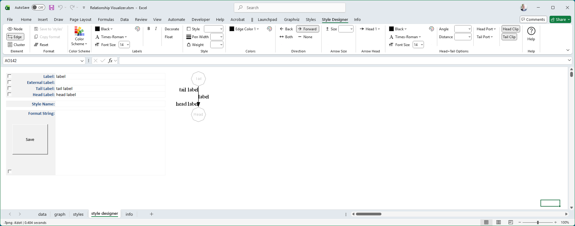 You define styles by making selections on the Style Designer ribbon tab. As you choose options, a format string is generated, and a sample rendering of the node, edge, or cluster is produced using the graphing engine and spline values from the Graphviz ribbon tab (explained later).