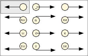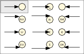 If a compass point is used, it must be one of the following: n, ne, e, se, s, sw, w, nw, c, or _. A compass point modifies edge placement so that the edge aims for the specified point on the port—or, if no port name is supplied, on the node itself. The compass point c targets the center of the node or port. The compass point _ indicates that Graphviz should choose the side of the port that lies on the exterior of the node; if no such side exists, the center is used instead. When a port name is provided without a compass point, the default compass point is _.