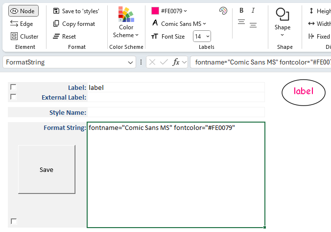 Use the ribbon, preview image, and format string just as you did for nodes and edges.
