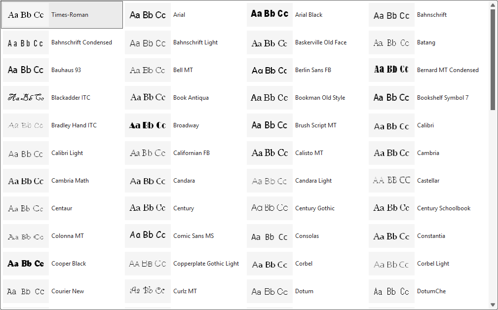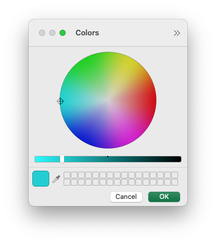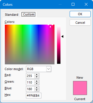 In addition to choosing from predefined color schemes, you can specify a custom color using the Color Dialog. To the right of each color choice dropdown is a small button with color icon which appears as: