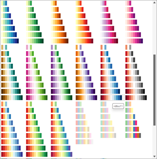 choosing rdbu11 updates the lists to values 1 through 11, displays color icons, and adds colorscheme=rdbu11 to the Format String.