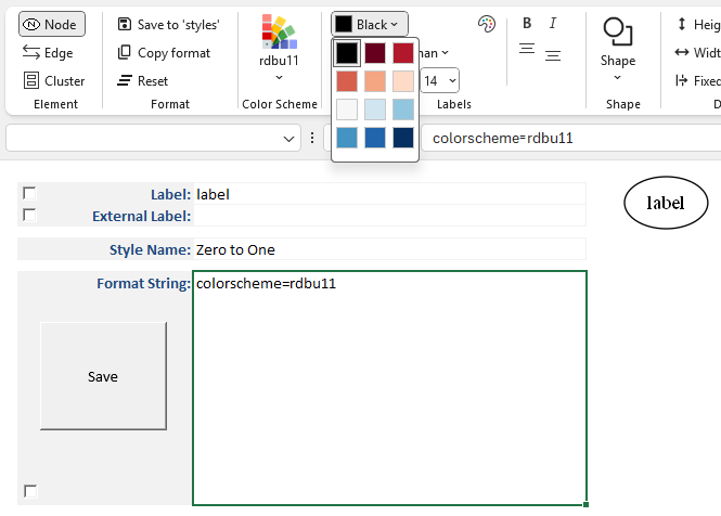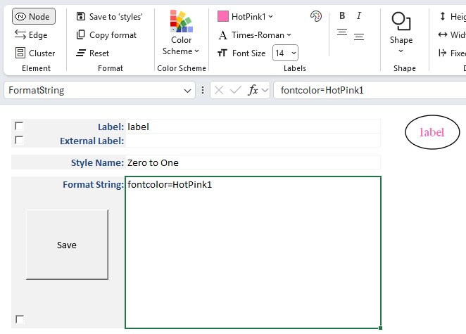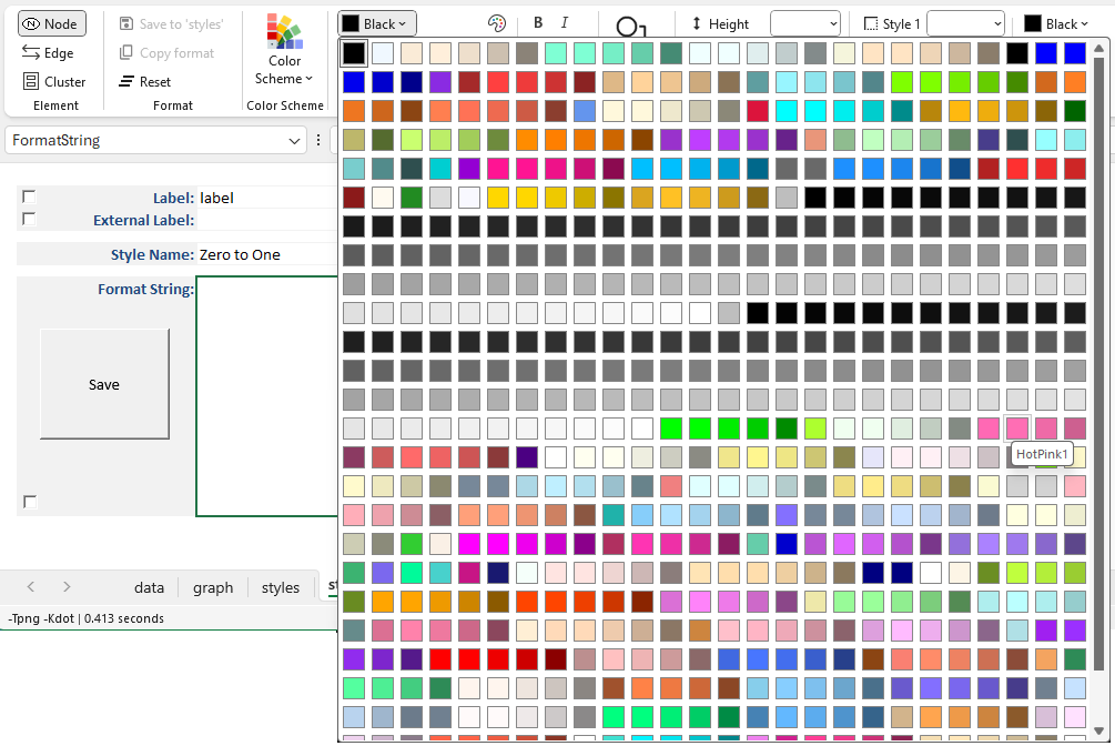 As you make selections the Format String cell builds a list of Graphviz style attributes and writes them to the large cell below: