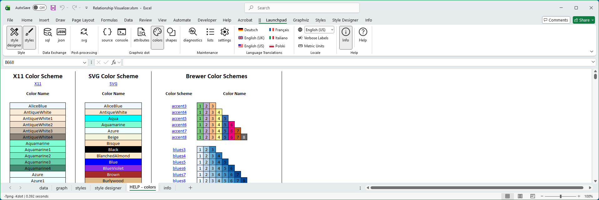 - The Colors button on the Launchpad ribbon shows or hides the HELP – colors worksheet.