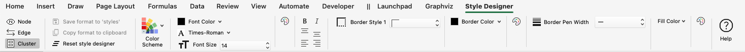 The Style Designer ribbon tab provides three dynamic design modes, controlled by the Element radio buttons in the left‑most group. These modes let you create node styles, edge styles, and cluster styles. The ribbon controls update automatically as you make selections.