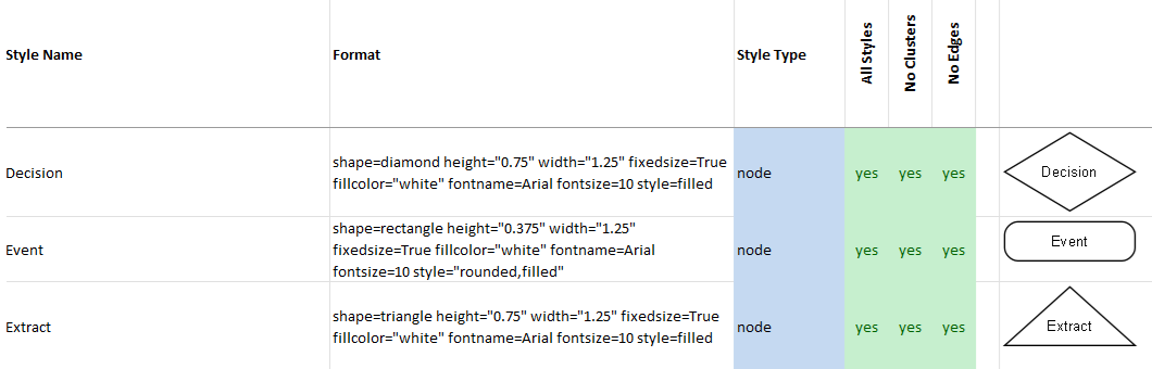 For example, the image below shows three Node style definitions created with the Style Designer and saved on the Styles worksheet: