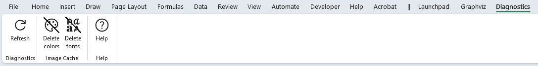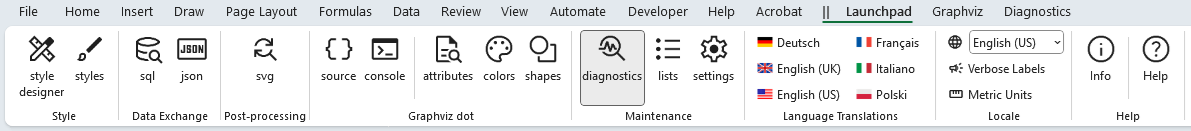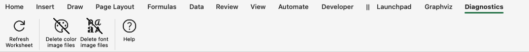 The Diagnostics ribbon tab is activated whenever the diagnostics worksheet is activated from the Launchpad. It appears as follows:
