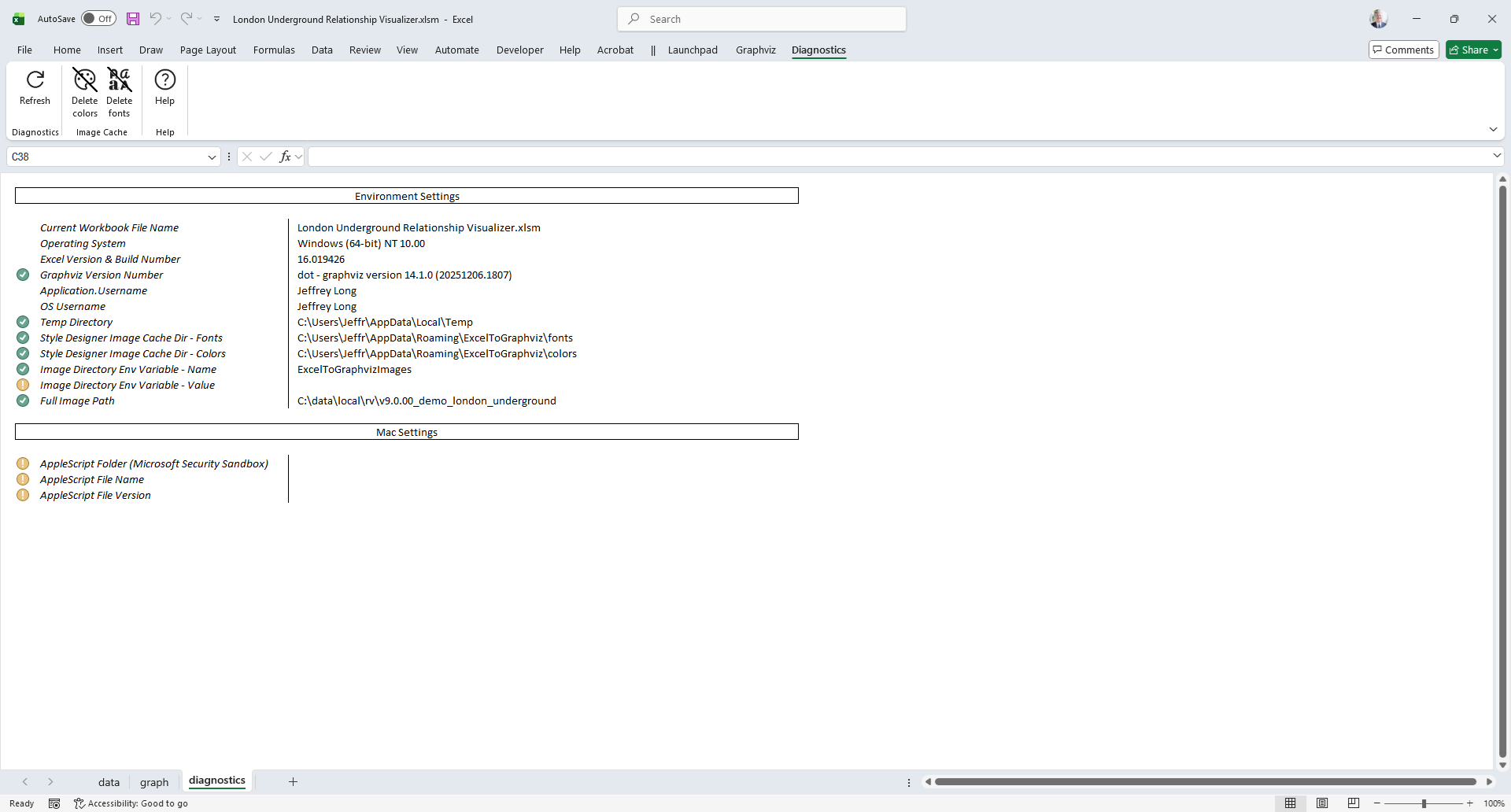 The diagnostics worksheet key information about the workbook and the environment in which it is being run.