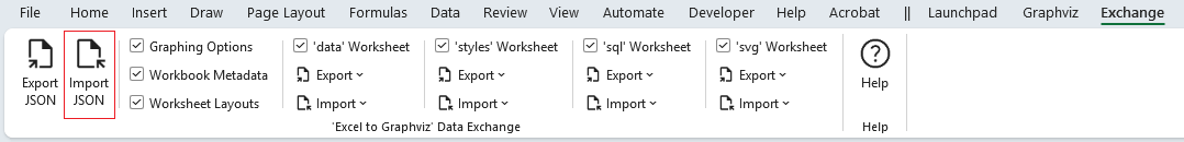 These limitations made it clear that a text‑based representation of the workbook’s data, styles, and settings was needed. The features that support exporting and importing this information are provided on the Exchange ribbon tab. There is no associated worksheet, as data exchange operates directly on the internal contents of the workbook.