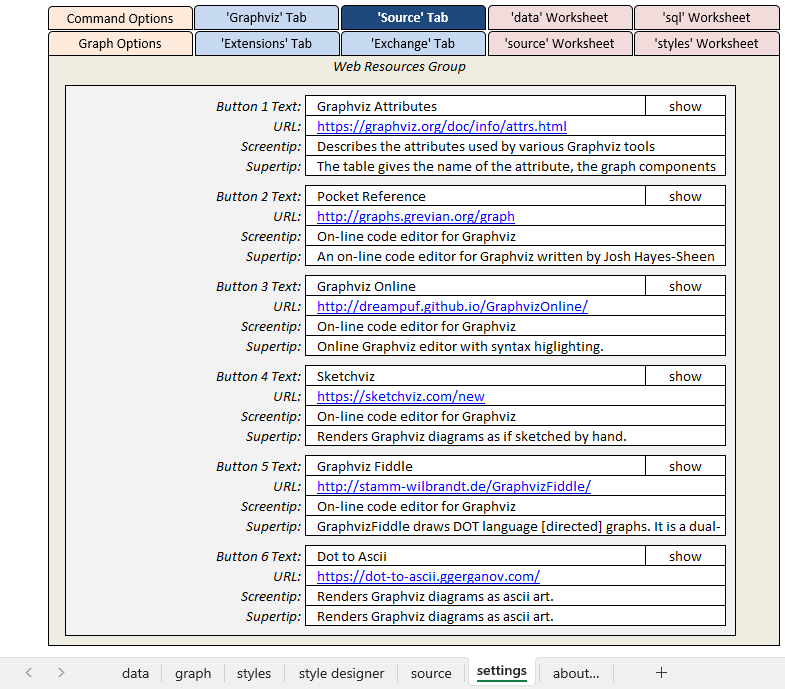 The Web Resources group dynamically supports six buttons which can launch the user's default browser and display a web page. Button text, tool tips, and the URL are specified in the settings worksheet. The worksheet as distributed contains links to Graphviz documentation and online Graphviz rendering tools.