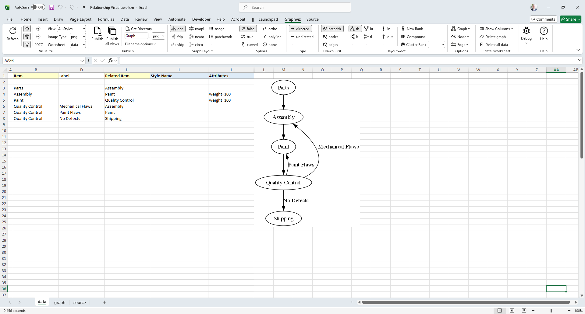 Understanding how the Relationship Visualizer transforms worksheet data into DOT source code can help you: