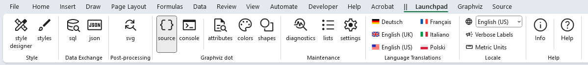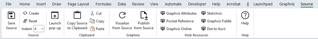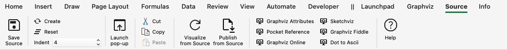 Now that you understand the basics of viewing Graphviz source code, let us look at the features contained in the Source ribbon tab. The Source ribbon tab is activated whenever the source worksheet is activated. It appears as follows: