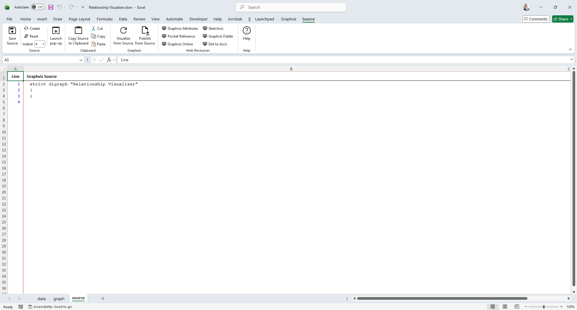 When we switch back to the source worksheet the Graphviz source code appears as: