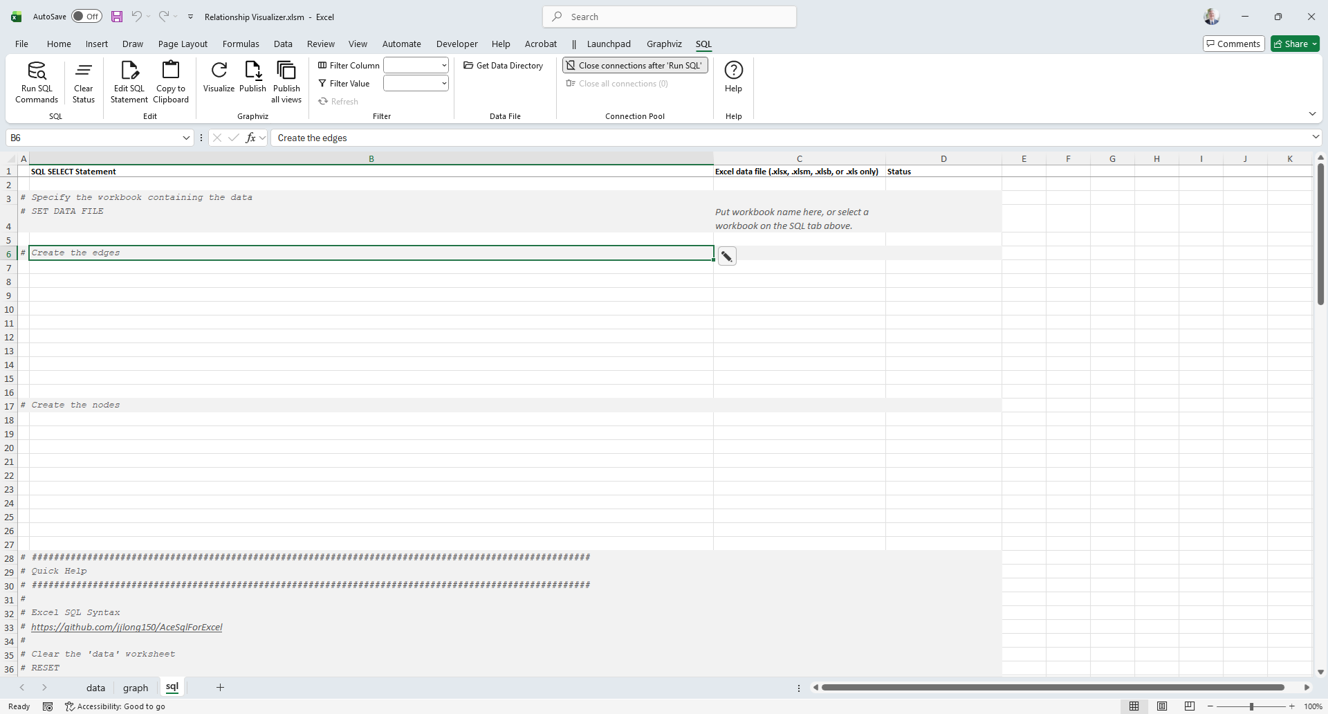 The Relationship Visualizer includes a worksheet named sql that abstracts away most of the complexity involved in writing ADO SQL. It lets you write SQL SELECT statements using ADO‑compatible syntax, while the tool automatically manages all connection details. Queries can reference either the Relationship Visualizer workbook itself or any other Excel workbook as the data source.