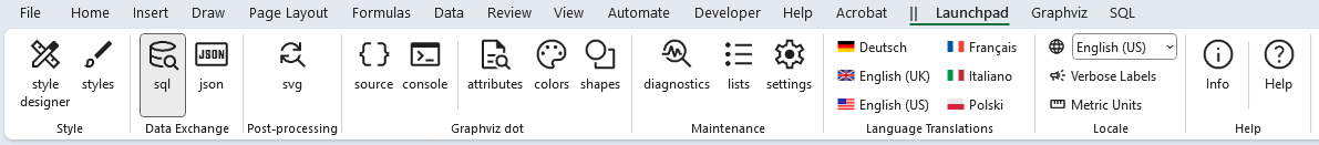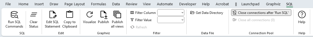| Publish | Button | Graphs the data in the data worksheet and writes the output to a file using the settings on the Graphviz ribbon tab. This duplicates the Publish command and streamlines exporting graphs after executing SQL queries. |