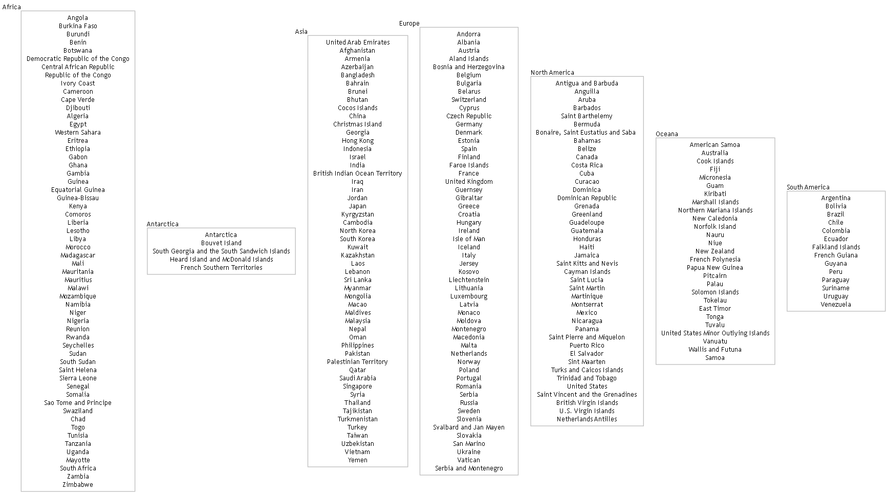 '\n' AS [SEPARATOR]Since there are seven global continents, the resulting diagram contains seven rectangle‑shaped nodes—one for each continent—each displaying its list of countries on separate lines. This produces a clear, vertically structured layout that makes it easy to compare continents at a glance: