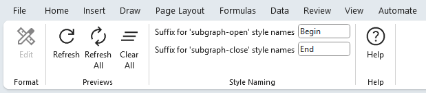 The cluster and subcluster style names will be modified at run-time to end with a begin/end suffix. The suffix values are configurable via the Styles ribbon tab.