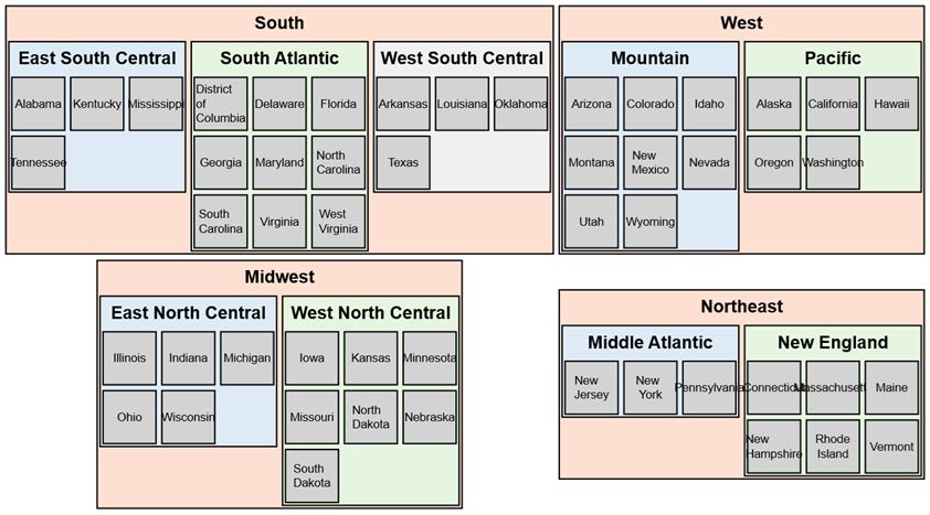 Use US census information to depict the 50 US states, grouping the states by by region of the country, and census division. State names should be in alphabetical order.