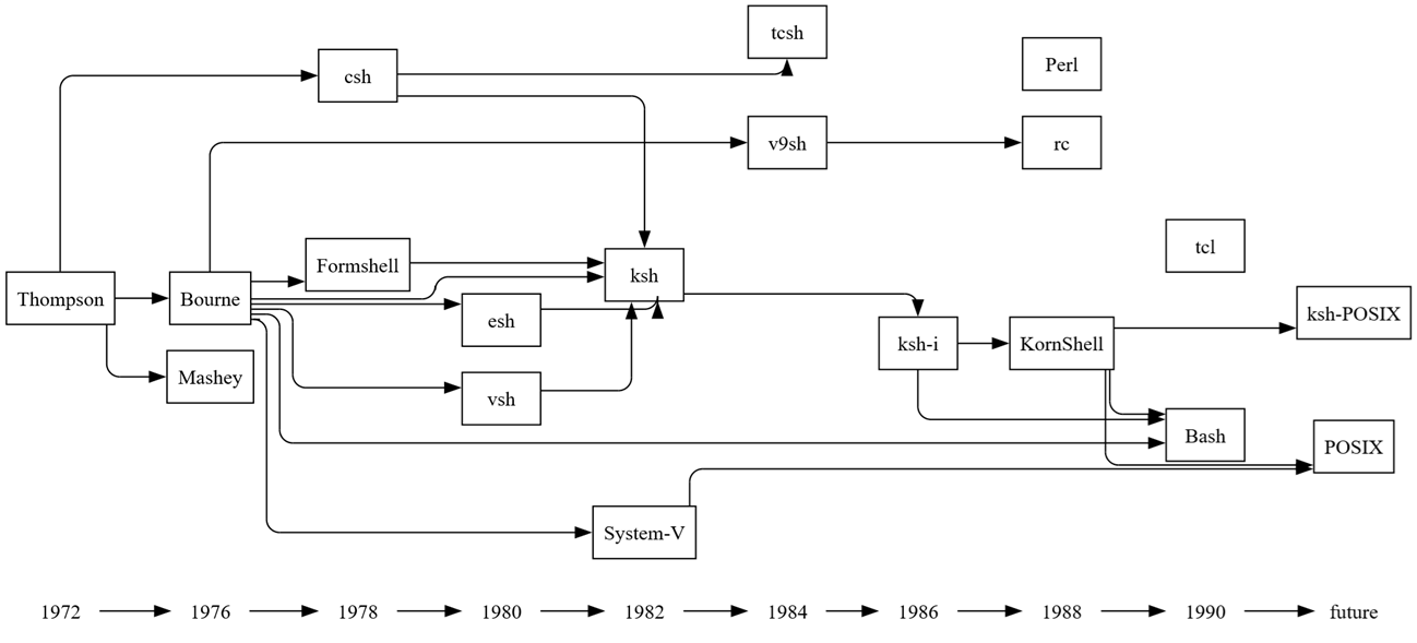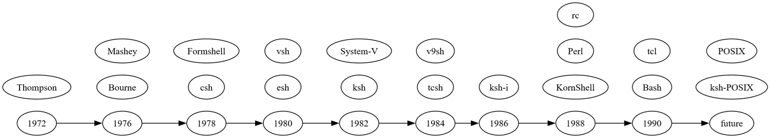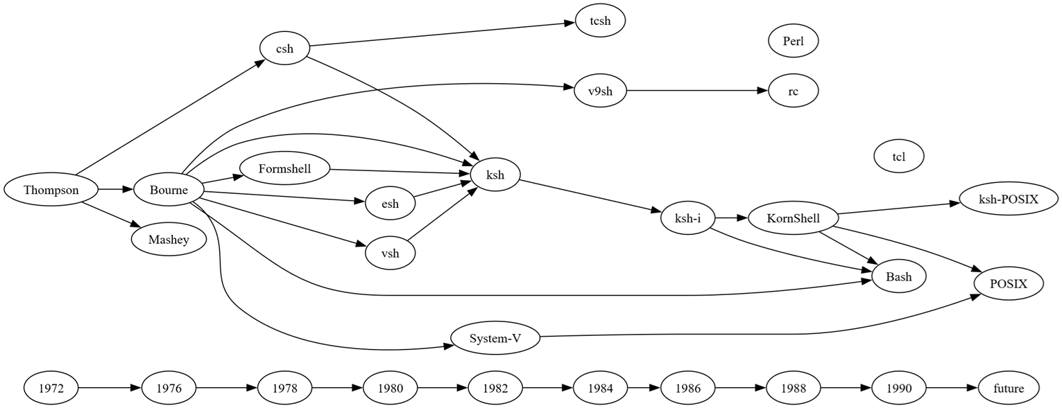 { rank="same"; "1988"; "KornShell"; "Perl"; "rc"; }
