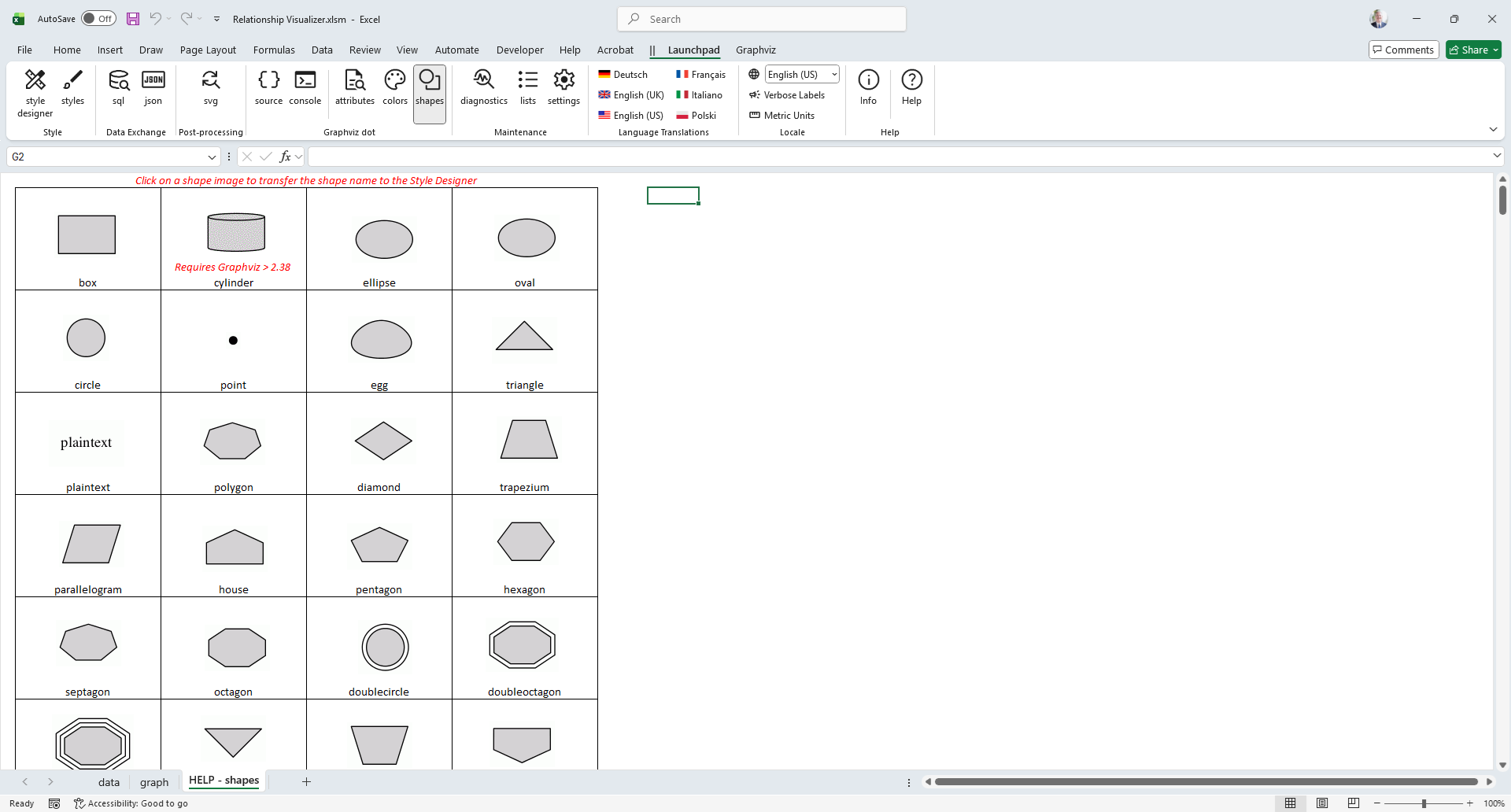 The HELP - shapes worksheet provides a glossary of the node shapes supported by Graphviz, along with their corresponding shape names.