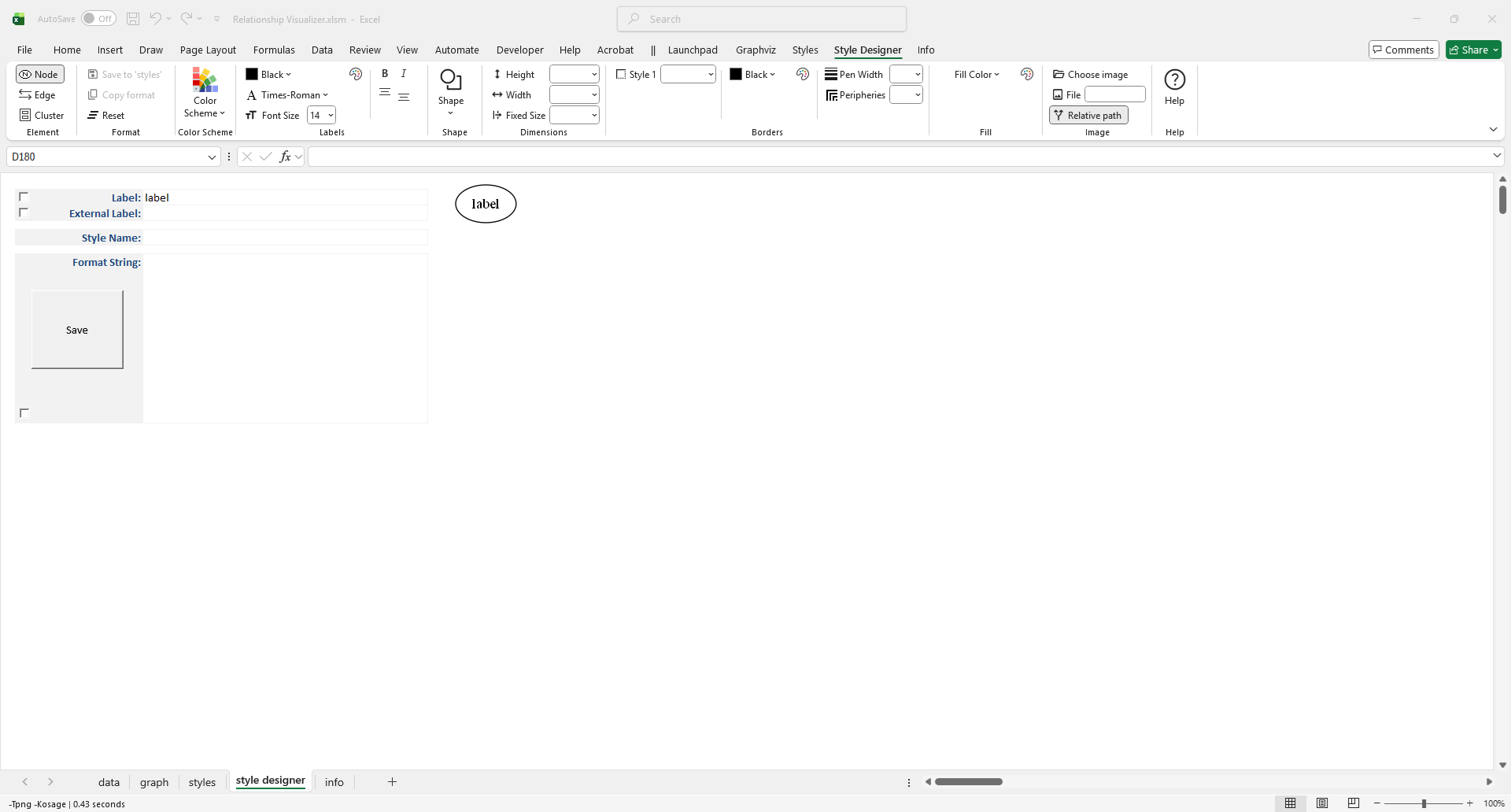 The style designer lets you adjust settings through dropdown lists and immediately see a preview of how Graphviz will render the node, edge, or cluster. You can fine‑tune the attributes until you are satisfied with the appearance, then save the resulting style definition to the styles worksheet.