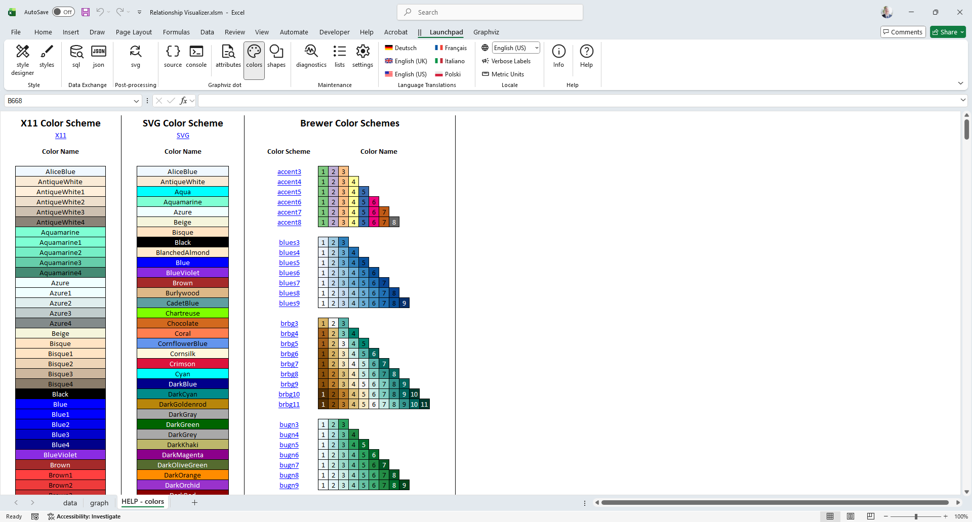 The HELP - colors worksheet provides a glossary of the color schemes and color names used by Graphviz, along with a visual sample of each color.