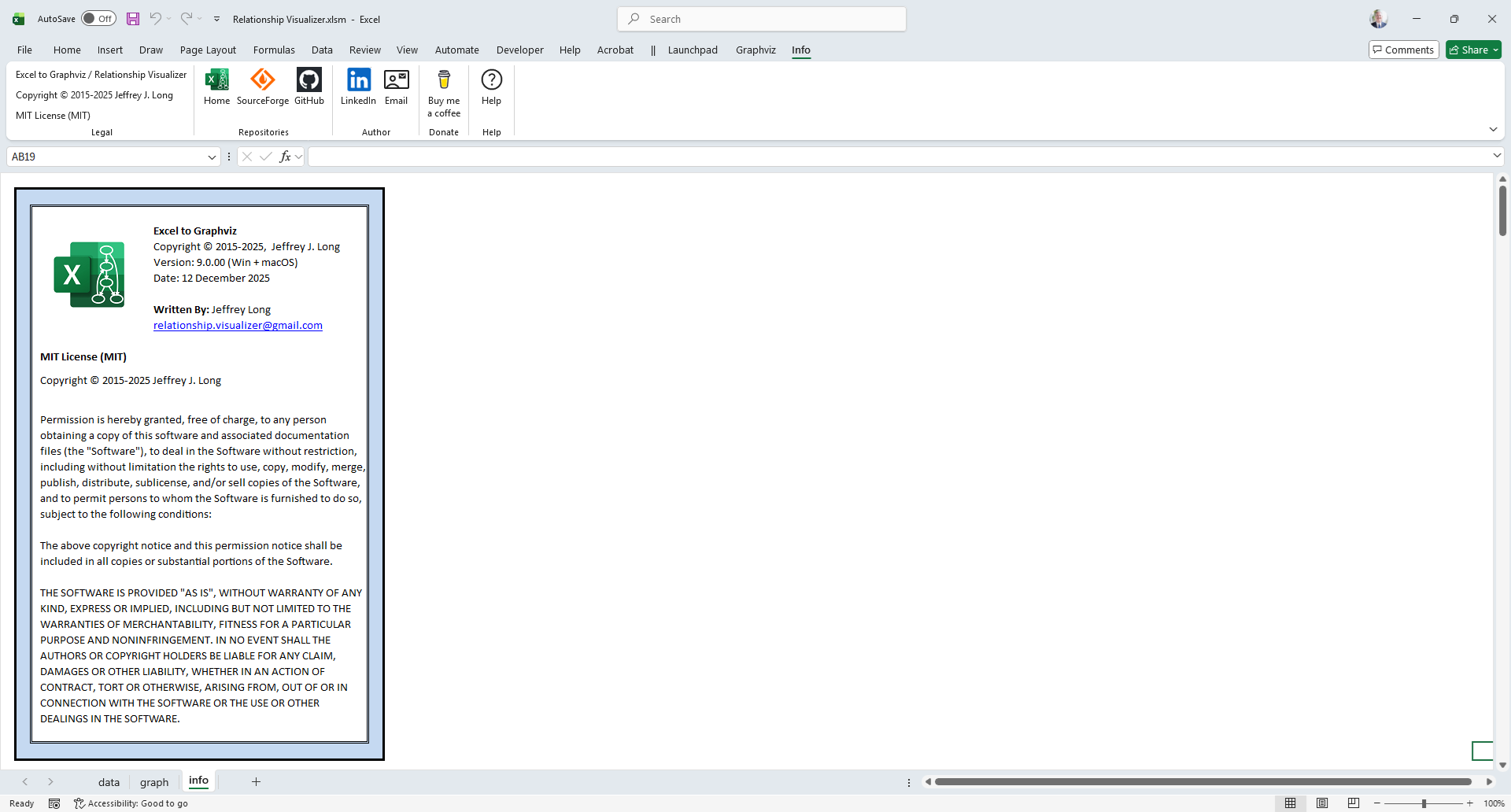 The info worksheet provides the Relationship Visualizer version number, contact information for the program’s author, and the licenses for both the Relationship Visualizer and the open‑source components it incorporates.