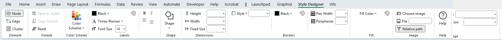 The Style Designer ribbon tab contains the action buttons and settings used to create style‑attribute strings for nodes, edges, and clusters. The style designer worksheet uses this tab exclusively.