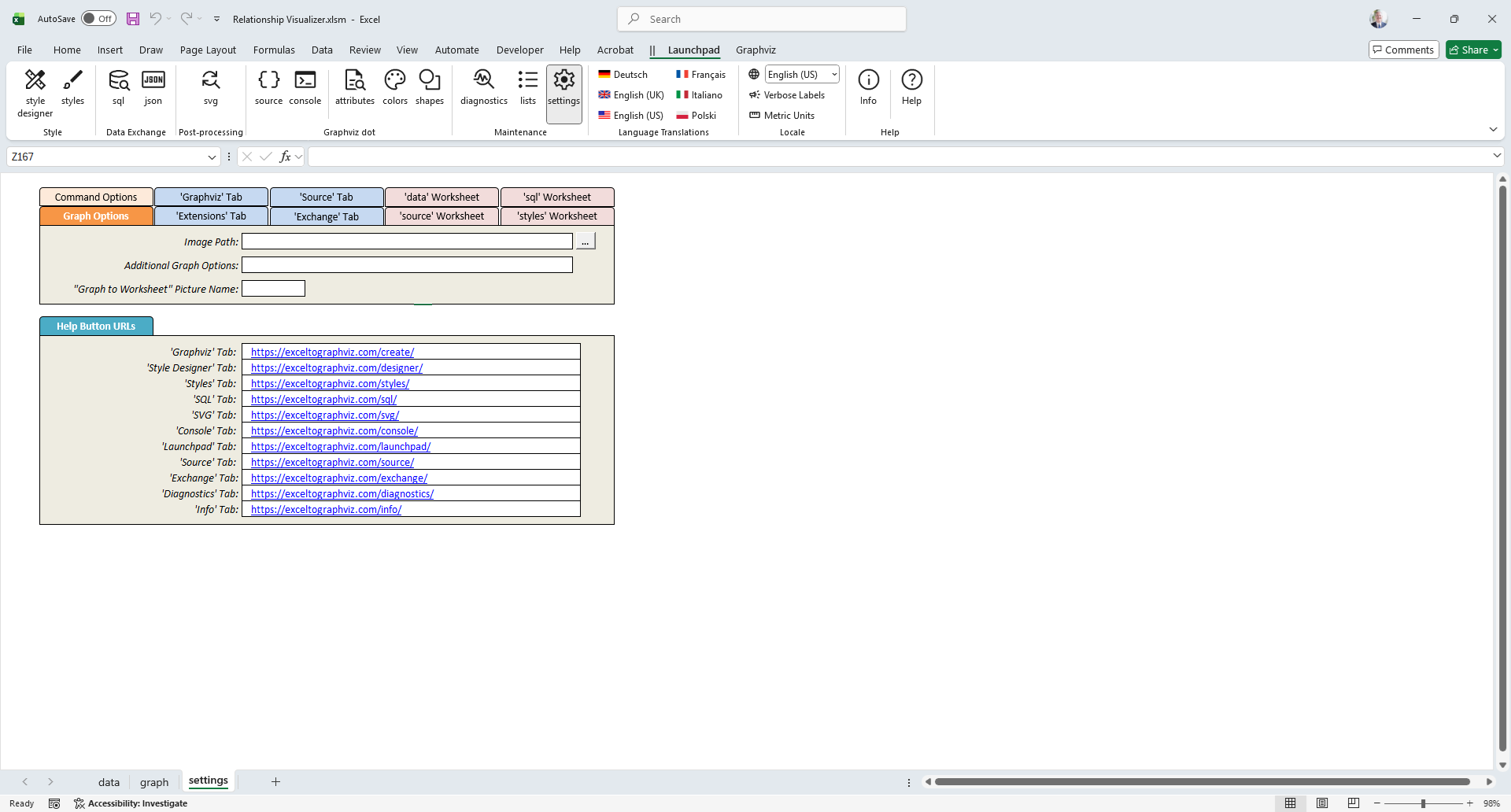The settings worksheet provides options for customizing how Graphviz runs, storing ribbon settings persistently, and configuring behavior across various worksheets.