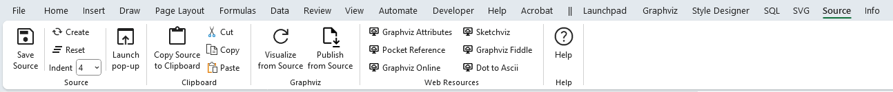 The Source ribbon tab is explained in more detail in Viewing DOT Source Code. See The Source Ribbon Tab for full details.