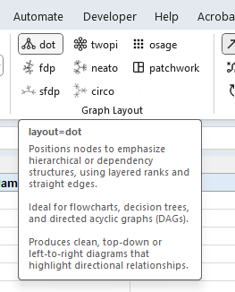 All ribbon controls include tool tips that explain their purpose, such as the example shown below for the dot layout button on the Graphviz ribbon tab. Pause the mouse pointer over any control to display its tool tip.