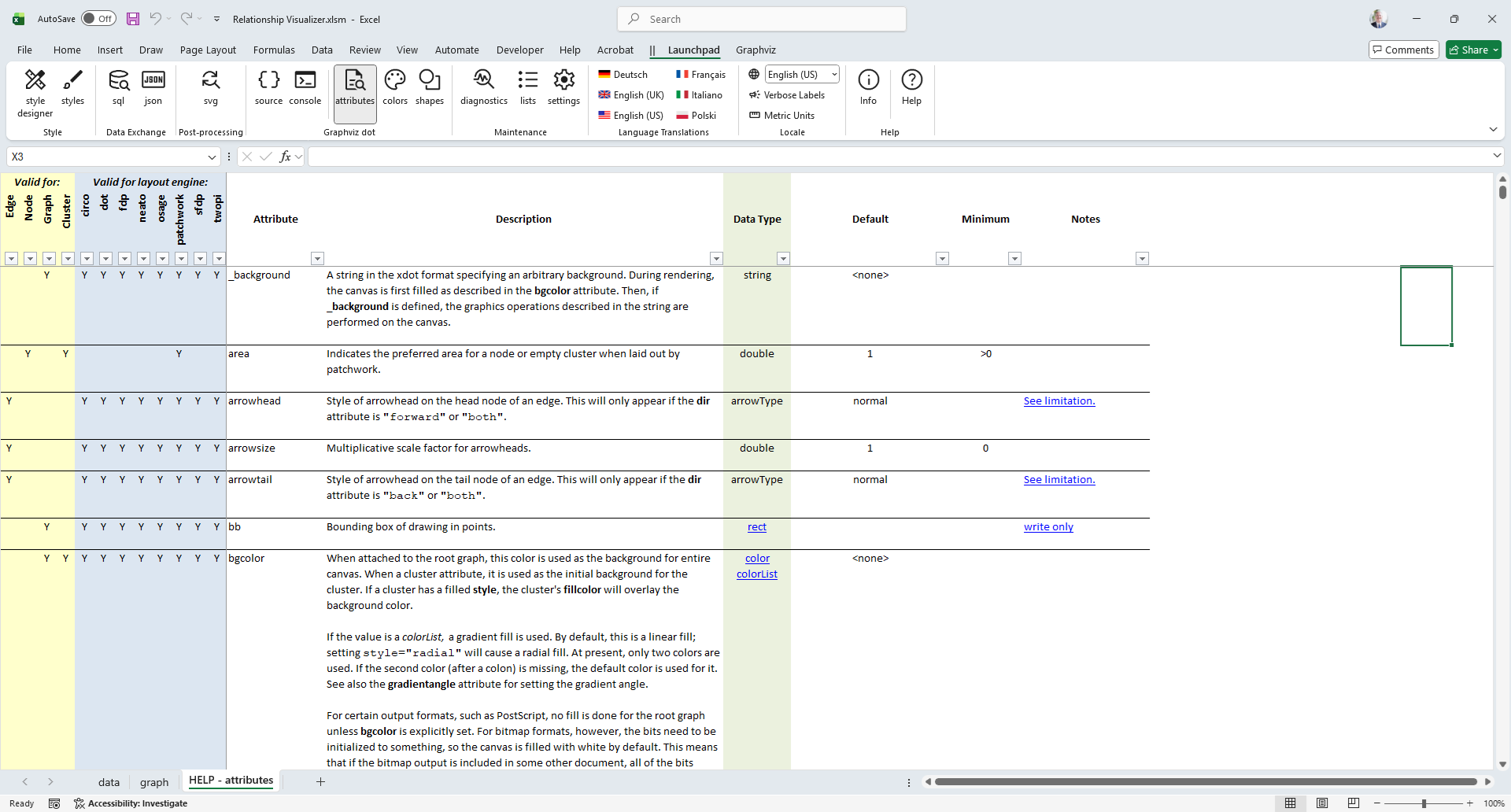 The HELP - attributes worksheet provides detailed descriptions of Graphviz language attributes, along with a cross‑reference showing where each attribute is used and which Graphviz layout engines recognize it.