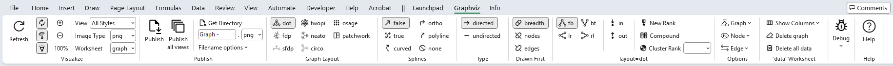 The Graphviz tab provides action buttons for creating graphs, along with numerous Graphviz options that control how the graph will be rendered. See The Graphviz Ribbon Tab for full details.