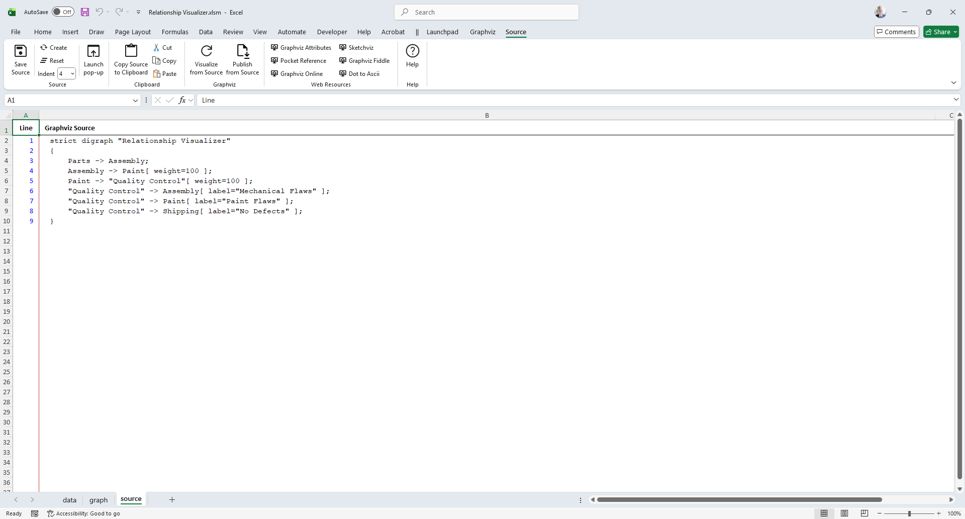 The source worksheet displays the DOT language source code generated from the data in the data worksheet after a graph has been created.