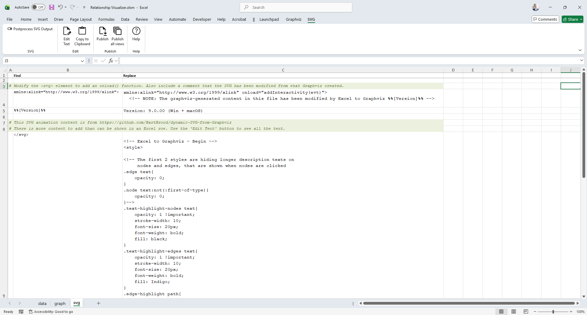 The svg worksheet provides tools for performing find‑and‑replace operations on graphs published in Scalable Vector Graphics (SVG) format. These operations act as post‑processing commands, allowing you to modify the generated SVG—for example, by inserting JavaScript to make the graphs interactive or dynamic.